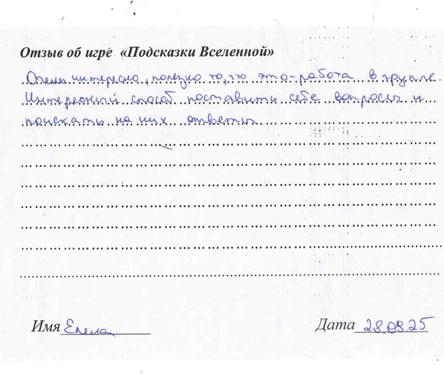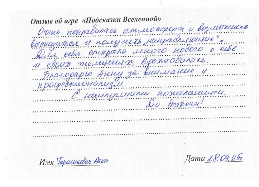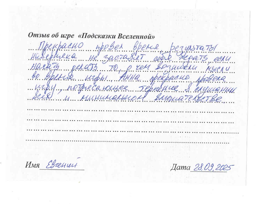 Недавно приняла участие в игре «Подсказки Вселенной». Это не только приятная и интересная возможность провести время, но и отличный инструмент, чтобы структурировать мысли, проследить закономерности и найти ответы на свои вопросы через подсказки, которые дает нам Вселенная. Отдельно хочется отметить психолога Анну: чутко и бережно она ведет всю игру каждого из участников. Огромная благодарность и мои рекомендации!